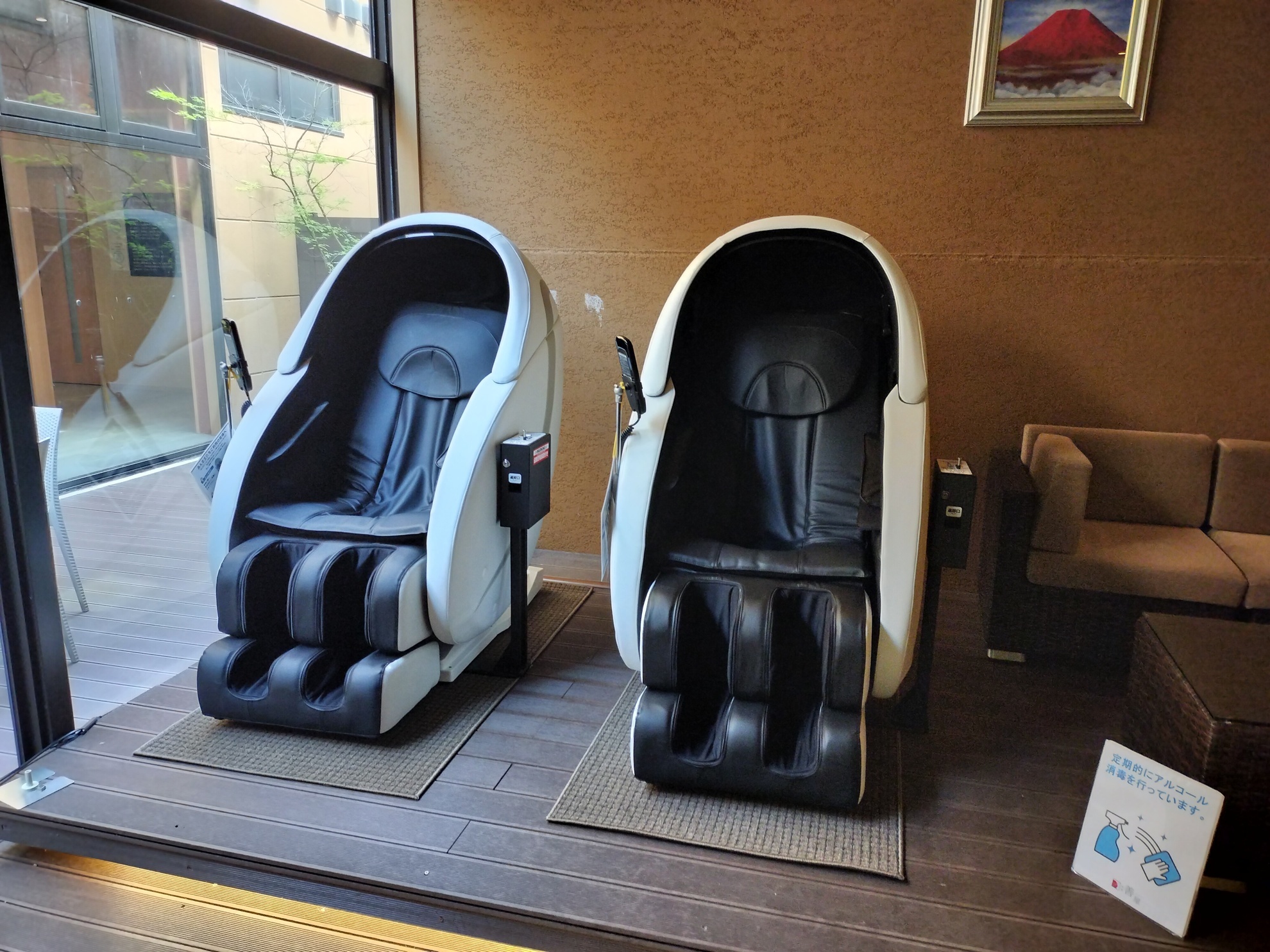 大浴場前に設置していましたマッサージチェアを新台に入替ました。今までと同じあんま王IVシリーズです。